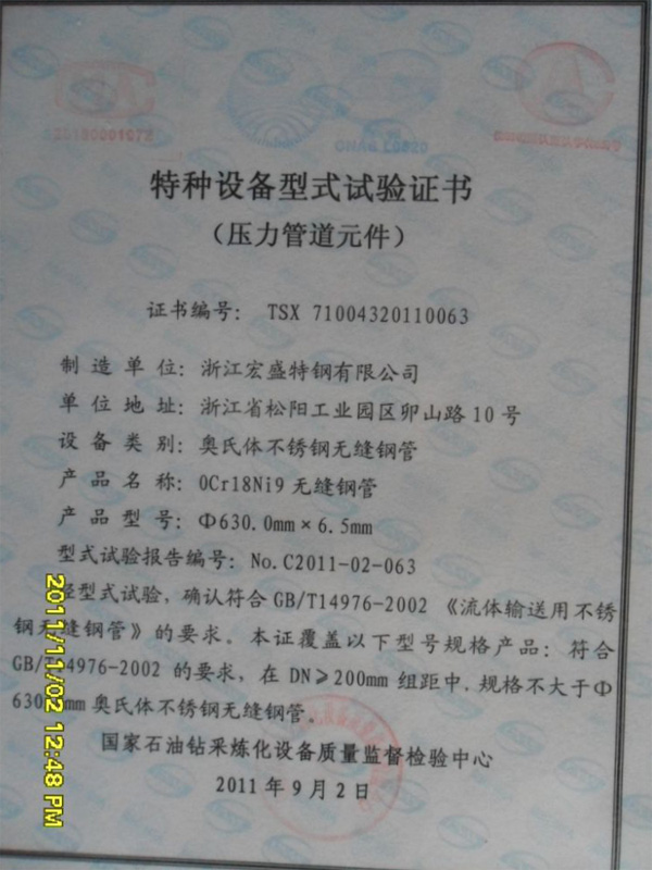 11年公司制造牌號:0Cr18Ni9 規格:630mm*6.5mm 的大口徑薄壁不銹鋼管(無縫),通過國家石油鉆采煉化設備質量監督檢驗中心的特種設備型式試驗,證書編號:TSX 71004320110063