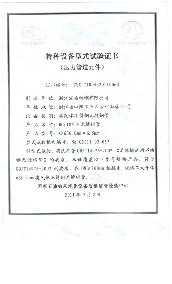 我們公司制造 牌號:0Cr18Ni9 規(guī)格:630mm×6.5mm 的大口徑薄壁不銹鋼管(無縫),通過國家石油鉆采煉化設(shè)備質(zhì)量監(jiān)督檢驗中心的特種設(shè)備形式試驗,證書編號:TSX 71004320110063 代表著我們在大口徑薄壁不銹鋼管(無縫)的制造技術(shù)在國內(nèi)處于領(lǐng)先的水準(zhǔn)。目前也是浙江地區(qū)唯一可生產(chǎn)此類規(guī)格大口徑薄壁不銹鋼管(無縫)廠家。