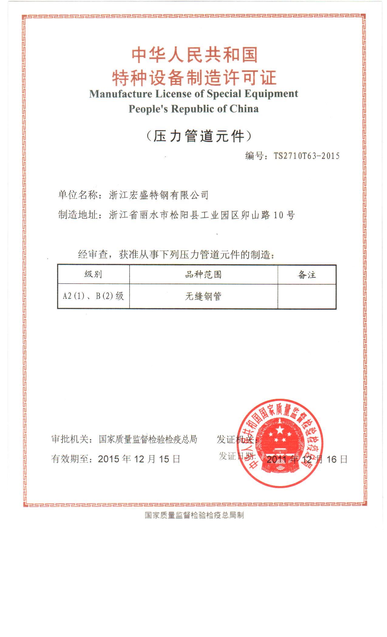 國(guó)家A2(1)、B(2)特種設(shè)備制造許可證(壓力管道元件),證書編號(hào):TS2710T63-2015